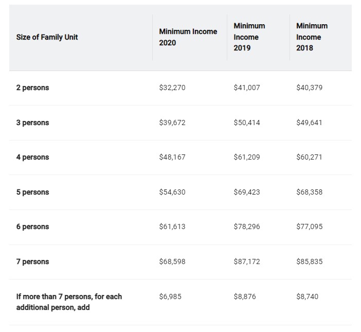 The MNI, which is revised yearly, is applicable to all pertinent sponsorship programmes for sponsors who reside in Canada but outside of Quebec. For each of the following years, sponsors are required to present their Notice of Assessment from the Canada Revenue Agency as proof that they have earned at least the required amount: